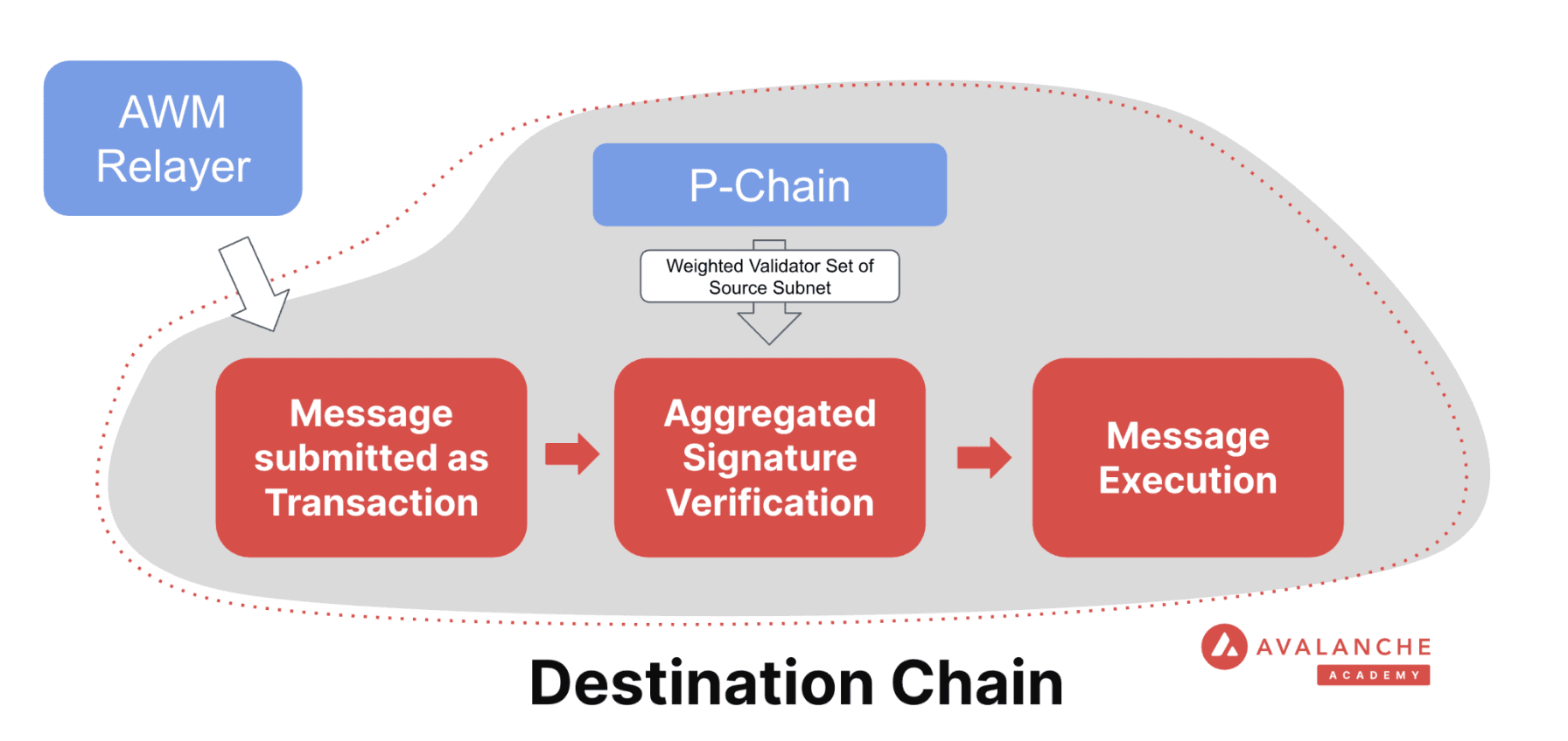 Next, the AWM Relayer delivers the message with the aggregated signature by simply submitting a transaction to the destination Avalanche L1. The transaction is propagated through the validator set of the destination blockchain just as any other regular transaction would be.